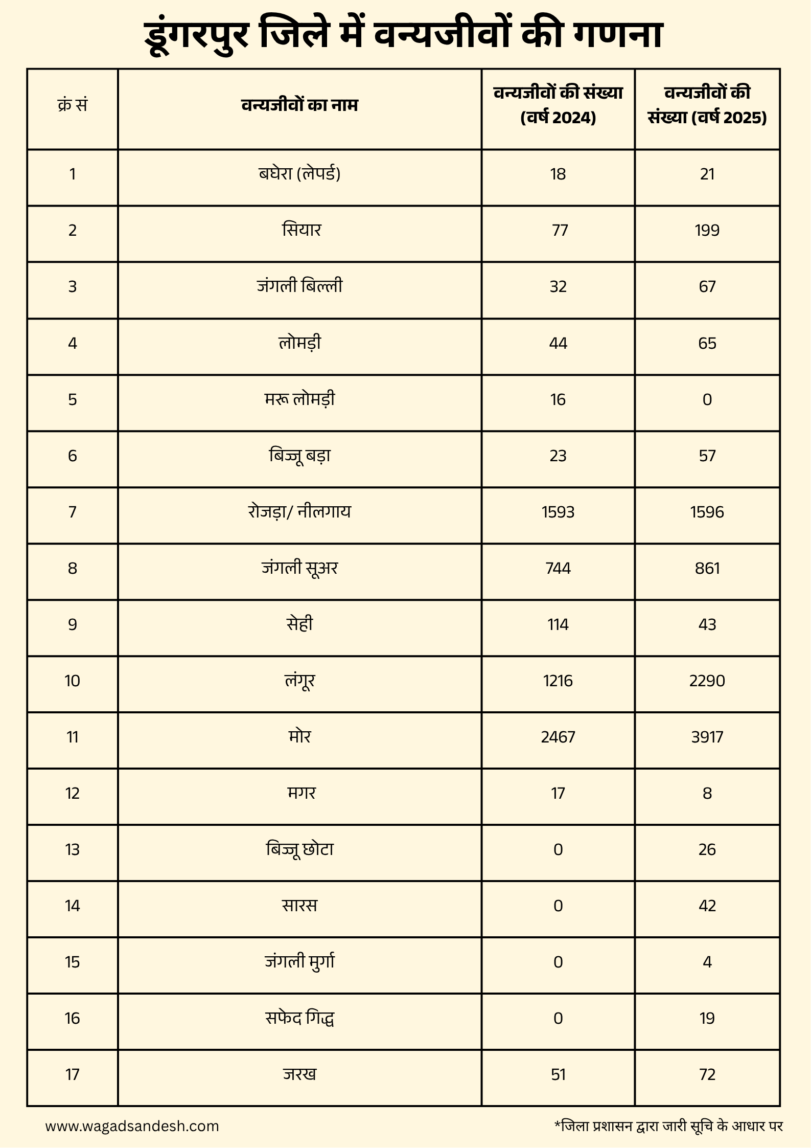 डूंगरपुर के जंगलों से आई खुशखबरी, वन्यजीवों की संख्या में वृद्धि, चार लेपर्ड समेत 3 हजार से अधिक जीव, मोरों की भरमार और दुर्लभ गिद्ध-सारस भी दिखाई दिए।