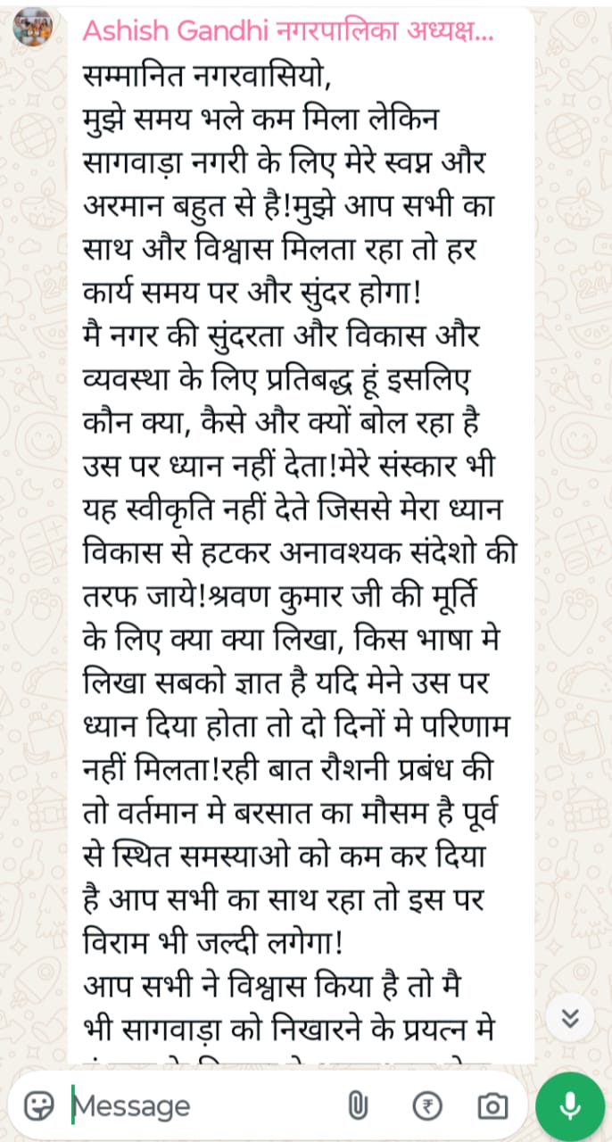 सागवाड़ा। नगरपालिका अध्यक्ष आशीष गांधी का एक भावुक संदेश सोशल मीडिया पर तेजी से वायरल हो रहा है। व्हाट्सएप ग्रुपों में साझा किए जा रहे इस संदेश में गांधी ने नगर के विकास को लेकर अपनी प्रतिबद्धता दोहराई है।उन्होंने लिखा मुझे भले कम समय मिला हो, लेकिन सागवाड़ा के लिए मेरे सपने और अरमान बड़े हैं। यदि आप सभी का साथ और विश्वास मिलता रहा तो हर कार्य समय पर और सुंदर रूप से पूरा होगा।"
